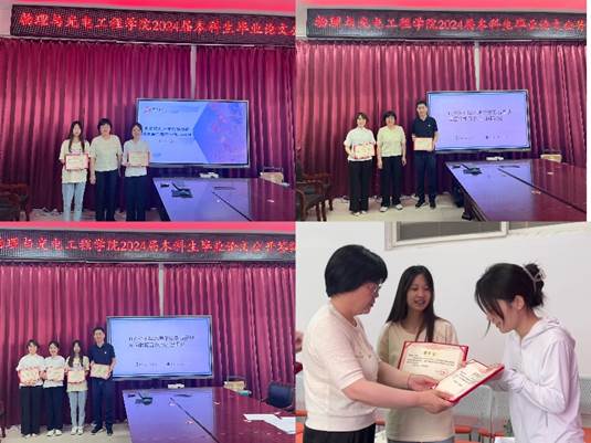 最后,经过答辩委员会的共同商议,熊梦鸽和李金玲以及他们的毕业论文指导教师赵宾和郭颖分别获物电学院“优秀本科论文”和“优秀指导教师”称号,由物电学院院长方莉俐颁发证书并合影留念。