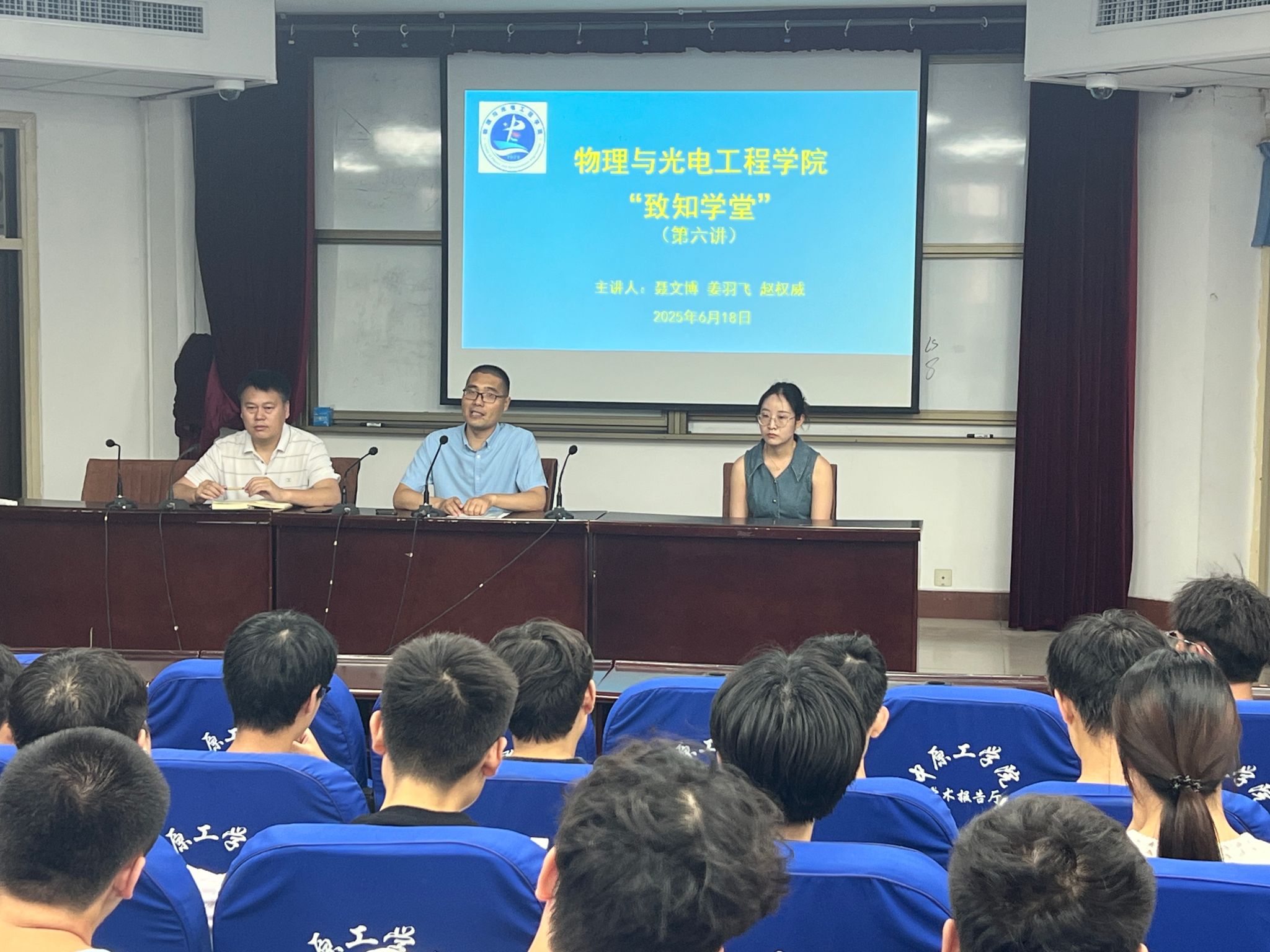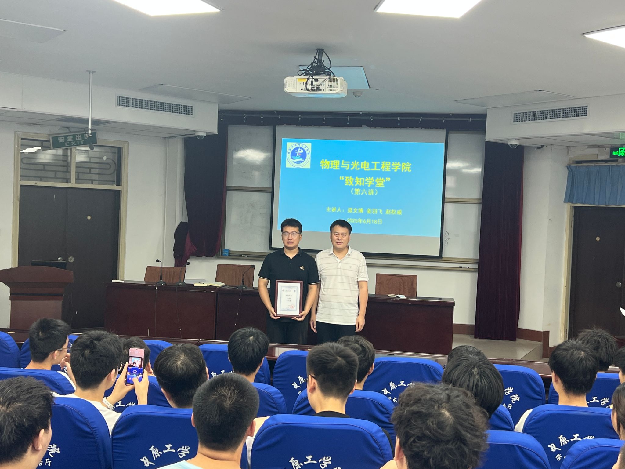 6月18日,物电学院“致知学堂”第六讲在4号楼311会场顺利召开。学术副院长王建军、学工办主任马亚琼、兼职辅导员刘悦及2022-2024级同学、全体研究生参会,会议由党总支副书记刘自范主持。本次讲座聚焦选调生、申请博士、就业三大方向,邀请聂文博、姜羽飞、赵权威三位优秀研究生毕业生分享经验,王建军为其颁发“91直播
