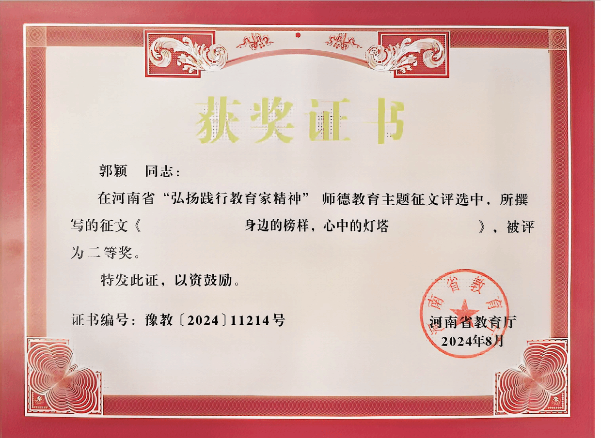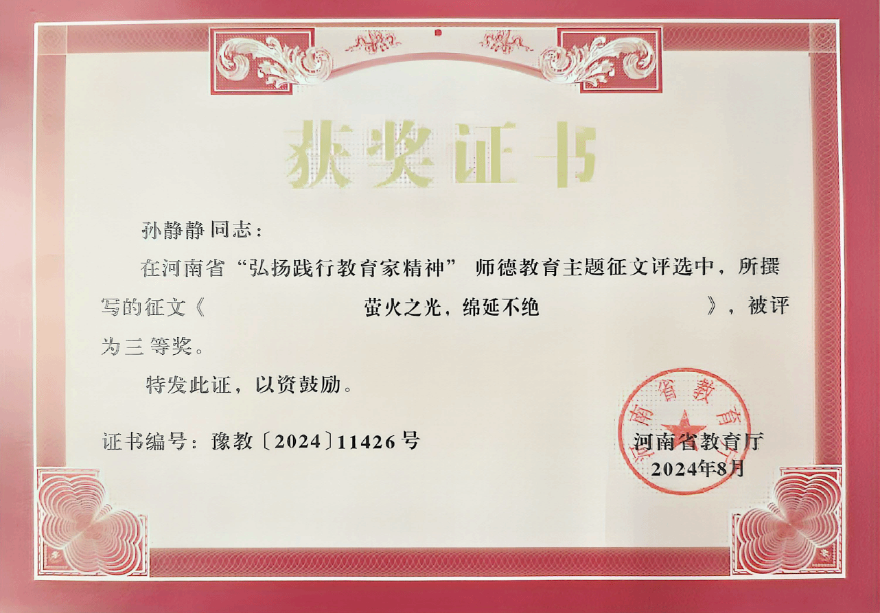 近日,河南省教育厅发布了《关于开展 “弘扬践行教育家精神”师德主题教育征文、演讲比赛活动的通知》,本次征文活动旨在弘扬教育家精神,加强师德师风建设,展示广大教师潜心教书育人的感悟和事迹,引导广大教师成为学生为学、为事、为人的“大先生”,用模范行动践行新时代优秀教师的光荣使命。