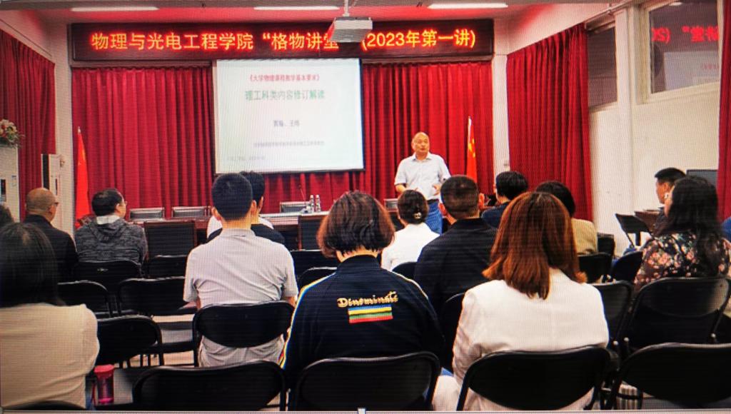 “格物讲堂”,并作开堂第一讲:“《大学物理课程基本要求》理工科类内容修订解读”。报告会由院党总支书记、院长方莉俐教授主持,学院近40名教师聆听了报告。