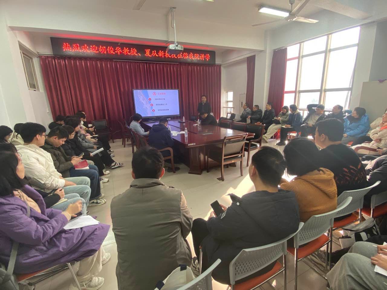 执行院长方莉俐、副院长郭鹏、学院骨干教师和在校研究生、校外专家等参加报告会,学术副院长王建军主持报告会。