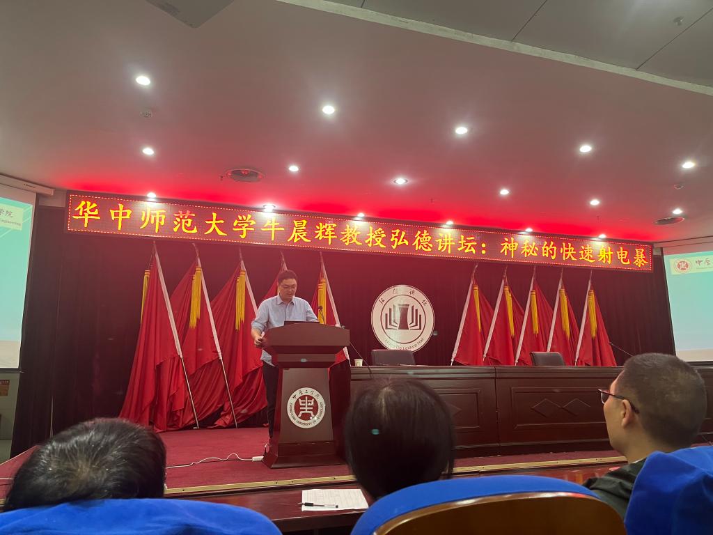 20231024日,华中师范大学研究员、牛晨辉教授做客弘德讲坛,在图书馆8楼学术报告厅为91直播 师生作了题为“神秘的快速射电暴”的学术讲座。91直播 全院师生和相关学院的部分师生聆听了此次报告。会前91直播 院长方莉俐教授为牛教授颁发了“弘德讲坛”的主讲证书。报告会由91直播 学术副院长王建军教授主持。